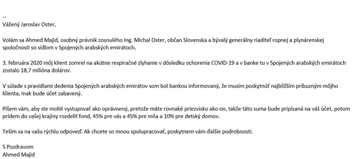 Nedávno sme na jednom zo vzdelávaní pre zamestnancov rozoberali phishingové e-mailové správy obsahujúce s prísľub zlepšenia sociálnej situácie. Medzi inými sa debata rozvinula mail - phishing o dedení v rôznych jeho prevedeniach.